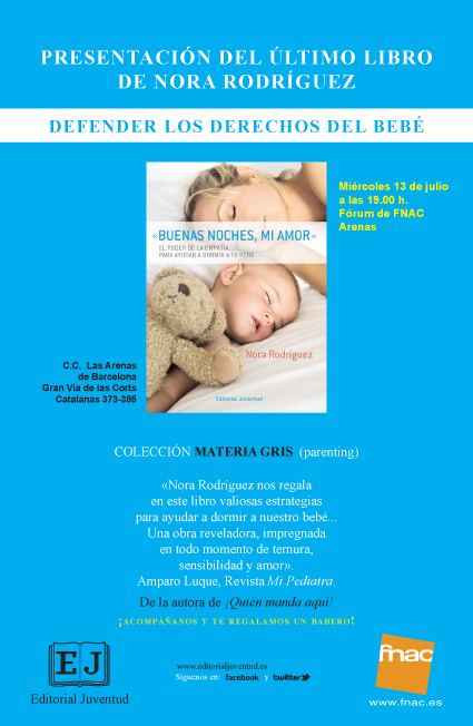 Avui, a les 19h, a l’FNAC de les Arenes presenten el llibre “Buenas noches mi amor“. Un llibre que pot ajudar en el procés d’adormir el nadó i que molts nens, mares i pares viuen amb certa angoixa. L’autora, Nora Rodríguez, hi serà i pot ser un bon pla per aquestes tardes de calor.