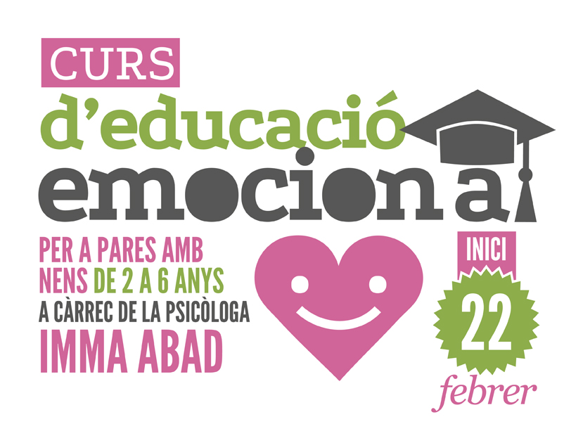 Eduquem les emocions jugant, és un conjunt de tallers per a pares amb nens de 2 a 6 anys que volen tenir eïnes i estratègies per identificar els sentiments i les emocions dels petits i educar-los en les mateixes, de la millor manera possible: jugant amb els més petits. El curs serà impartit per la psicòloga infantil Imma Abad, durant 7 sessions de 1h i 30 minuts, els dissabtes al matí.